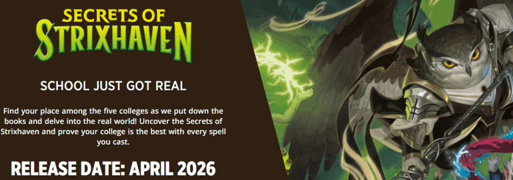 Head back to magic school! After Lorwyn and TMNT, we’re swinging into Strixhaven for a deeper dive into Arcavios’ most mystical university. This set expands on the campus we know and love with new students, spells, and lore hooks.